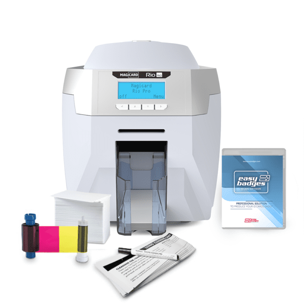 Magicard Rio Pro Complete Single Sided ID Printer System for MAC & PC comes with Easy Badges Beginner Software, cleaning kit, print ribbon, and PVC cards to print 100 single sided ID cards. Lifetime email and phone support included.